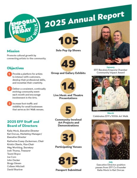 The Emporia First Friday Art Walk was established in 2016 by Kaila Mock and Joel Smith with the mission to promote cultural growth by connecting artists to the community. EFF is a non-profit 501(c)(3) organization in Emporia, Kansas.