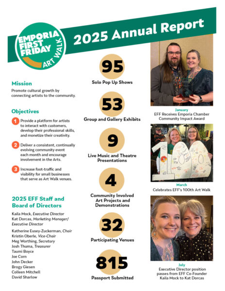 The Emporia First Friday Art Walk was established in 2016 by Kaila Mock and Joel Smith with the mission to promote cultural growth by connecting artists to the community. EFF is a non-profit 501(c)(3) organization in Emporia, Kansas.